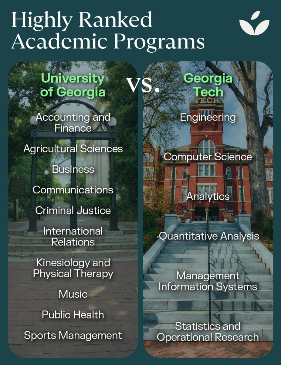 In terms of a UGA vs GT academic comparison, both have stellar academic reputations but are strong in different areas. The University of Georgia offers an education grounded in the liberal arts, while Georgia Tech’s curriculum is STEM focused. This infographic shows which programs are highly ranked at each school.